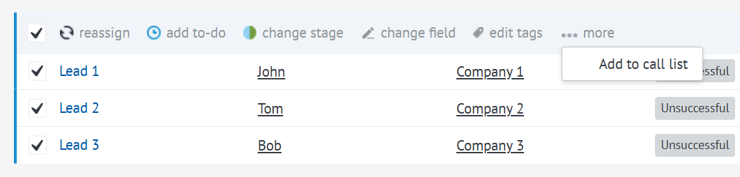 Call lists can be generated from the Contacts, Companies and Leads pages. In order to create a call list, select the desired entities and add them to the call list via the More menu.