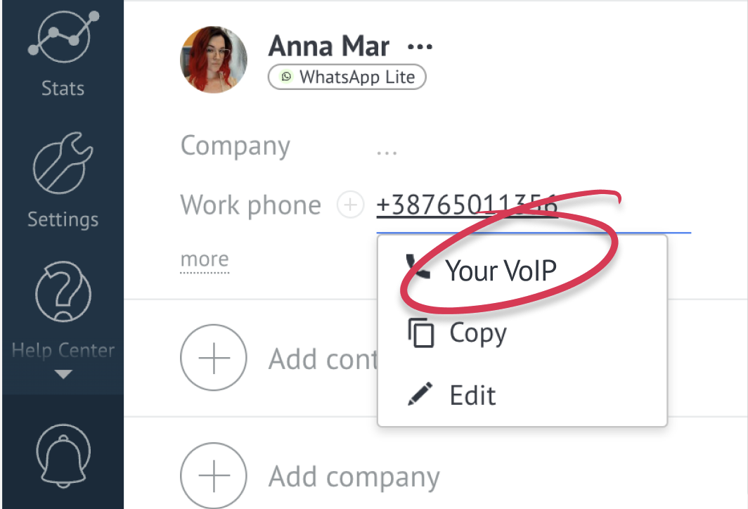 Kommo allows managers to make calls from any contact, company, or lead card by simply clicking on the phone number in the card.