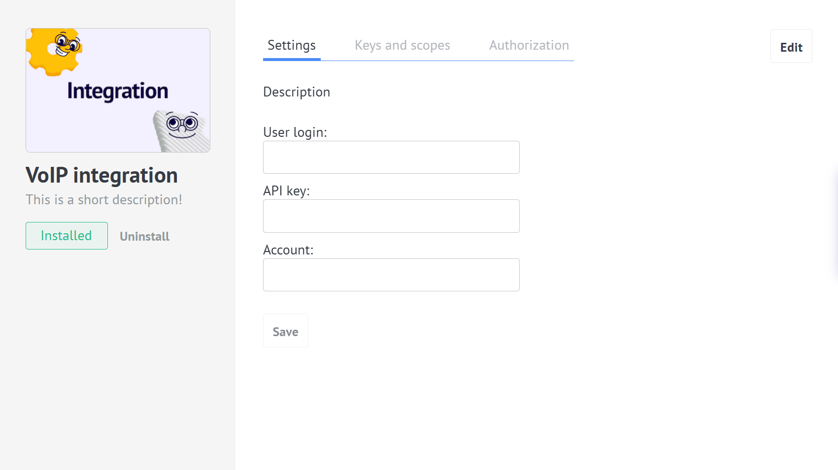 After the user installs the integration from Kommo Marketplace, the integration should show a modal window for settings where the user can perform some actions, such as providing the credentials to access the VoIP service. These credentials are known only to the administrator of the VoIP account. Another option is to use OAuth 2.0 for authorization.